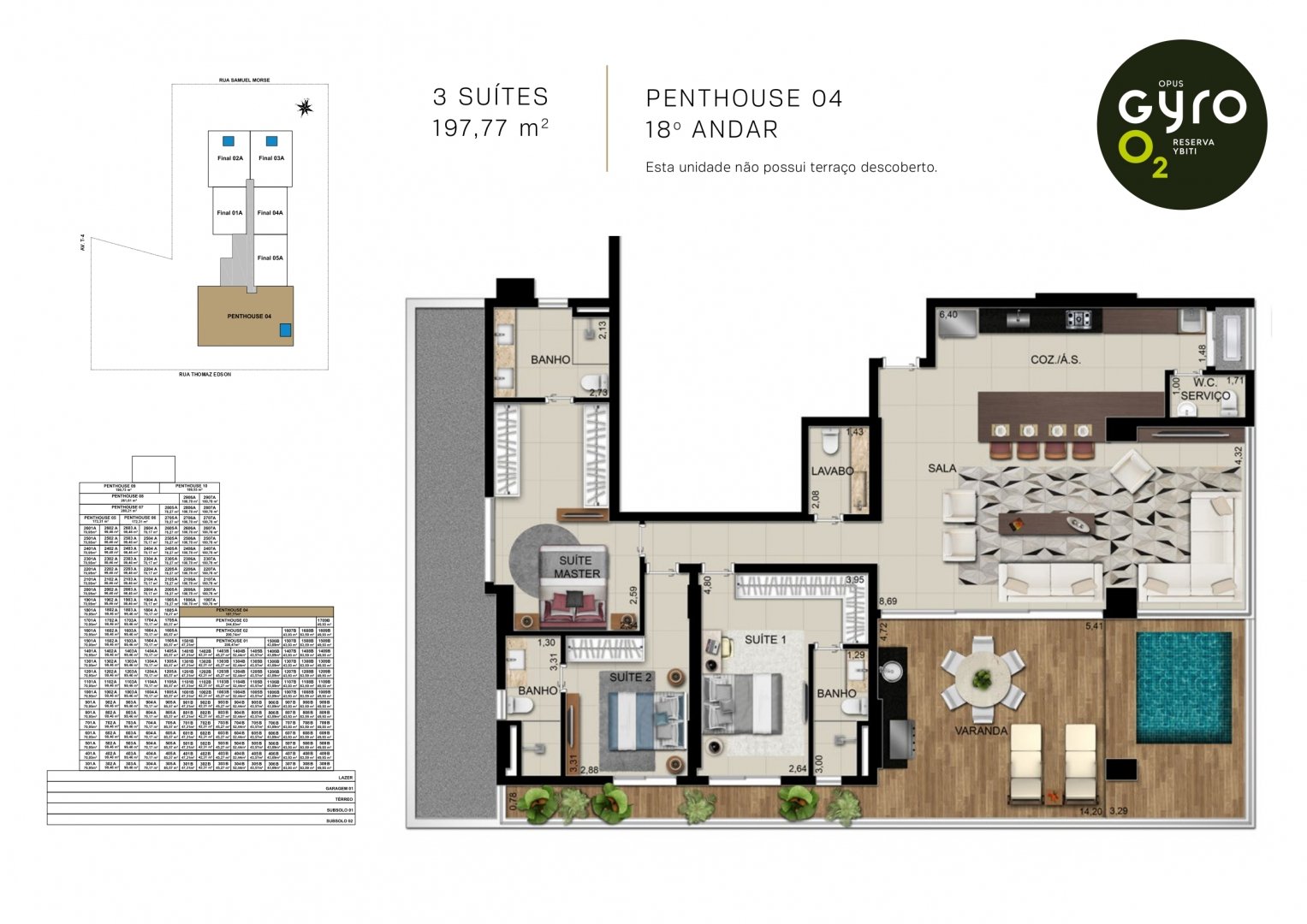 Unidades penthouses com terraços descobertos e piscinas, com jardineiras com vegetações variadas que conferem privacidade entre as unidades.