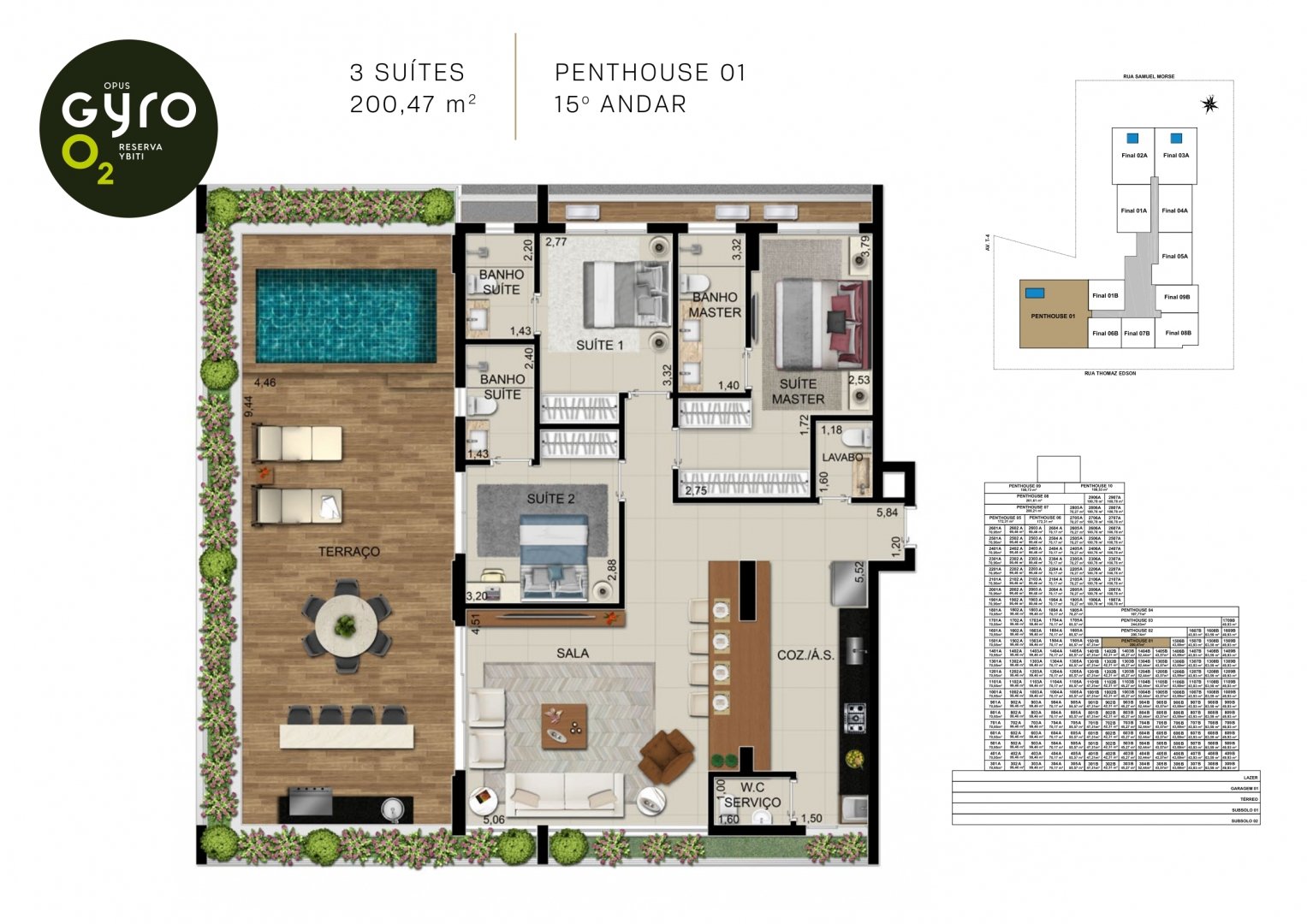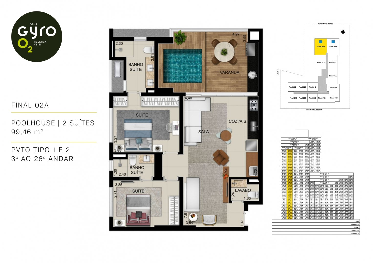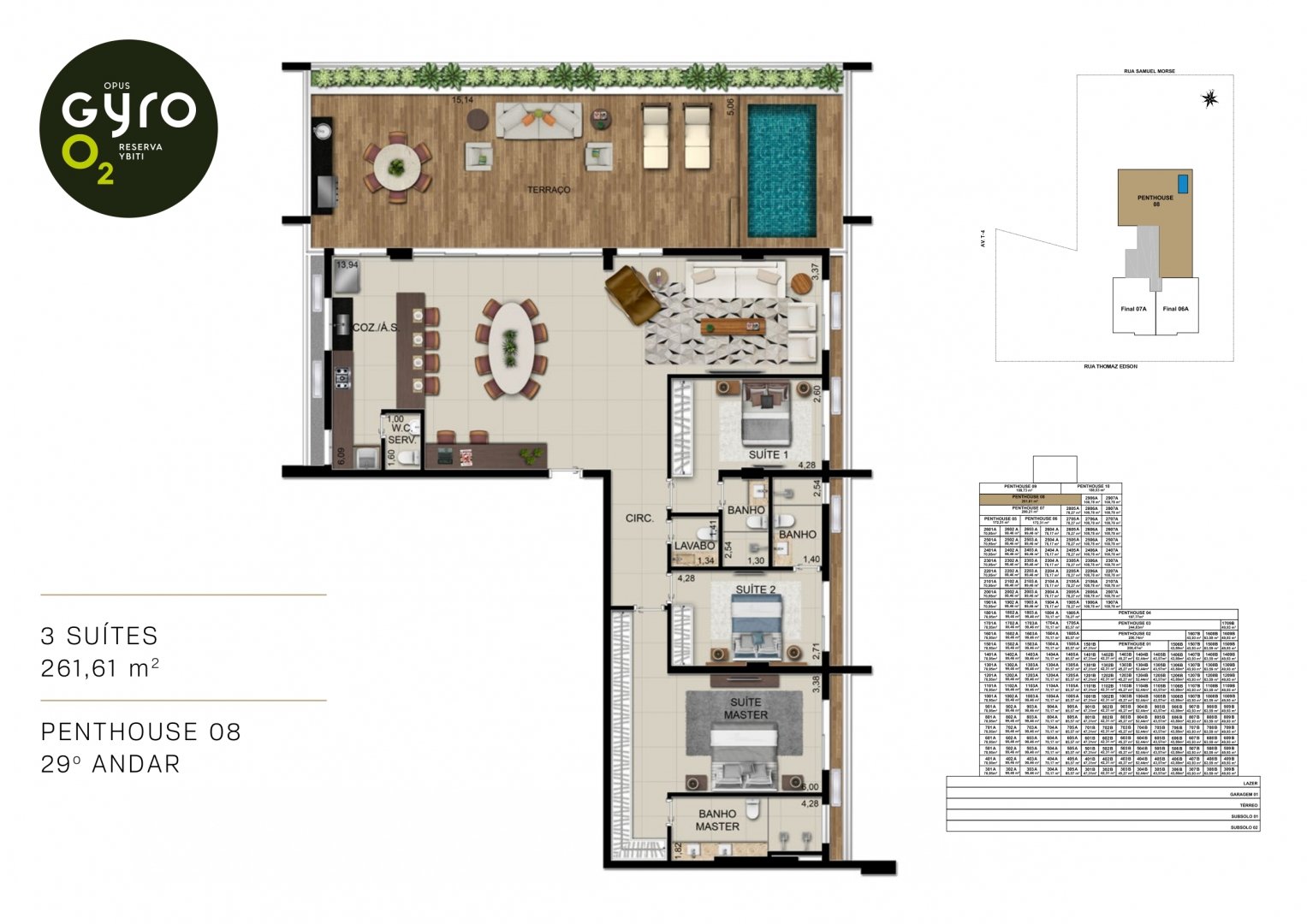 São 1800m² de área com piscinas infantil e adulto com raia de 25m. As piscinas ficam 2º pavimento e tem vista para a Reserva Ybiti com guarda corpo de vidro.