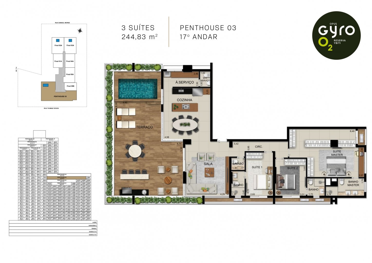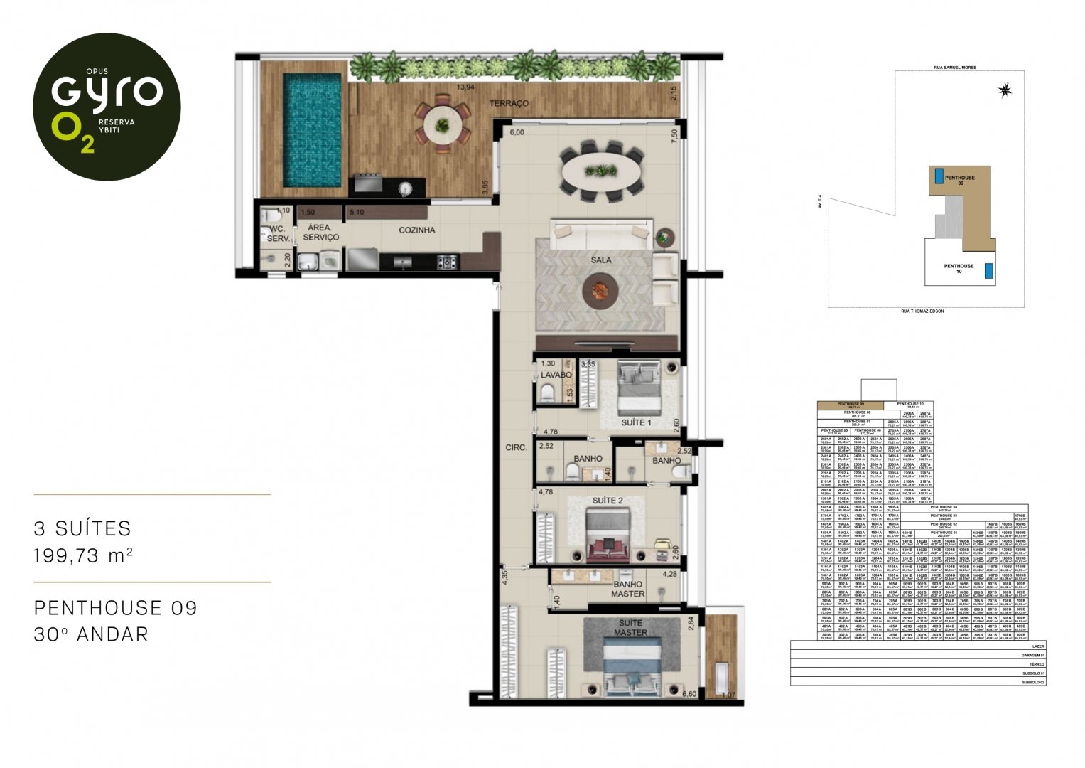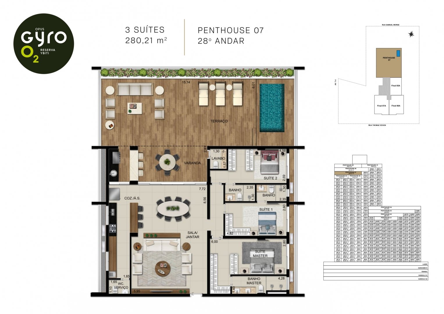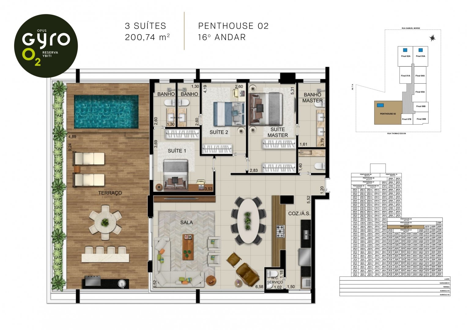 São 1800m² de área com piscinas infantil e adulto com raia de 25m. As piscinas ficam 2º pavimento e tem vista para a Reserva Ybiti com guarda corpo de vidro.